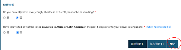 最後他這裡會問你目前有沒有感冒拉之類的身體狀況,或是最近6天有沒有去過非洲跟南美等等的,都沒有的話就點否,然後填完一個人可以點下面的添加旅客繼續填另一個人的資料。