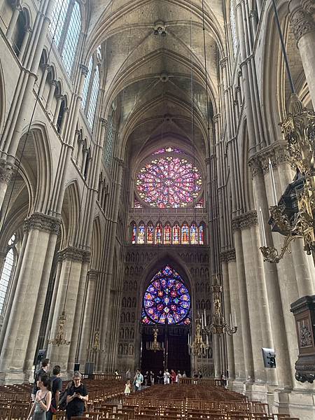 最震撼的,是那巨大的 玫瑰花窗。藍與紅交織的光落在我身上,就像替我披上了一件彩色斗篷。
