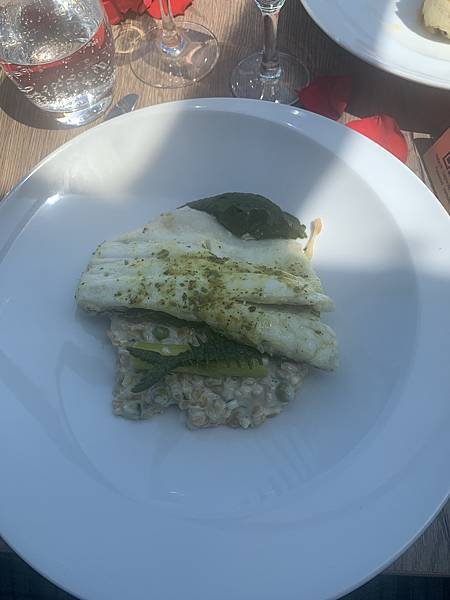 香煎鱸魚配燉飯與香草醬:外皮香酥,內裡軟嫩,搭配豆類燉飯與翠綠香料,法式溫柔一擊。