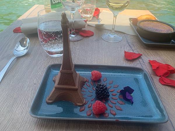 你沒看錯,甜點是立體的「巧克力艾菲爾鐵塔」冰淇淋!搭配莓果點綴,擺盤精緻到讓人不忍動口。